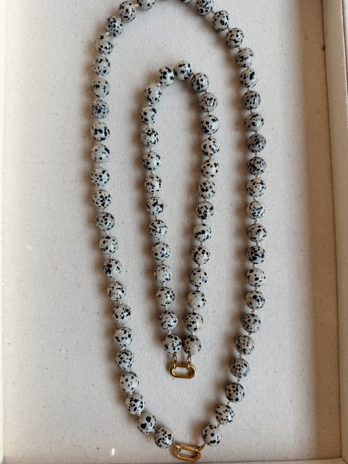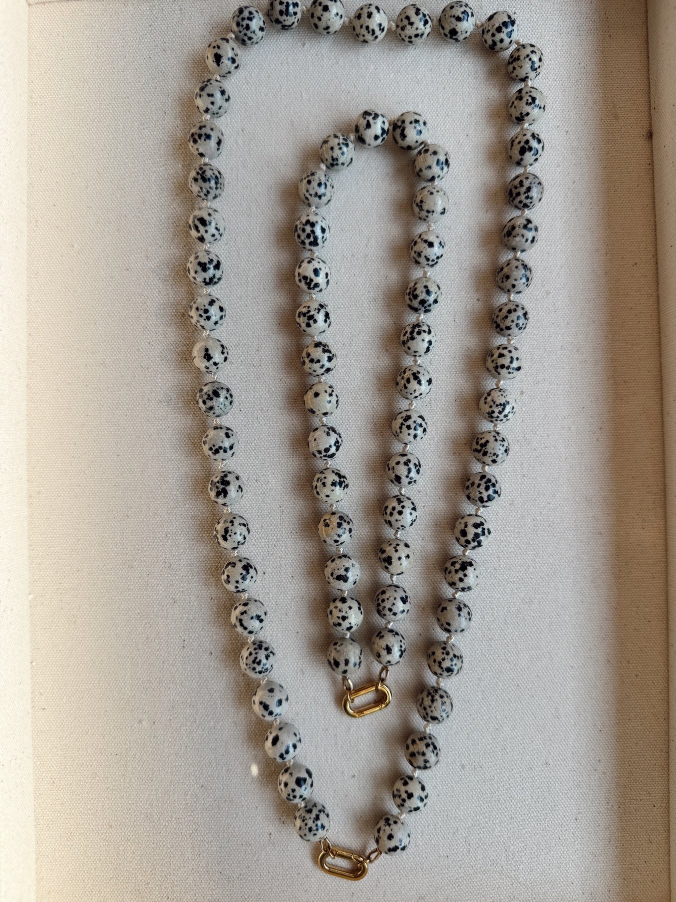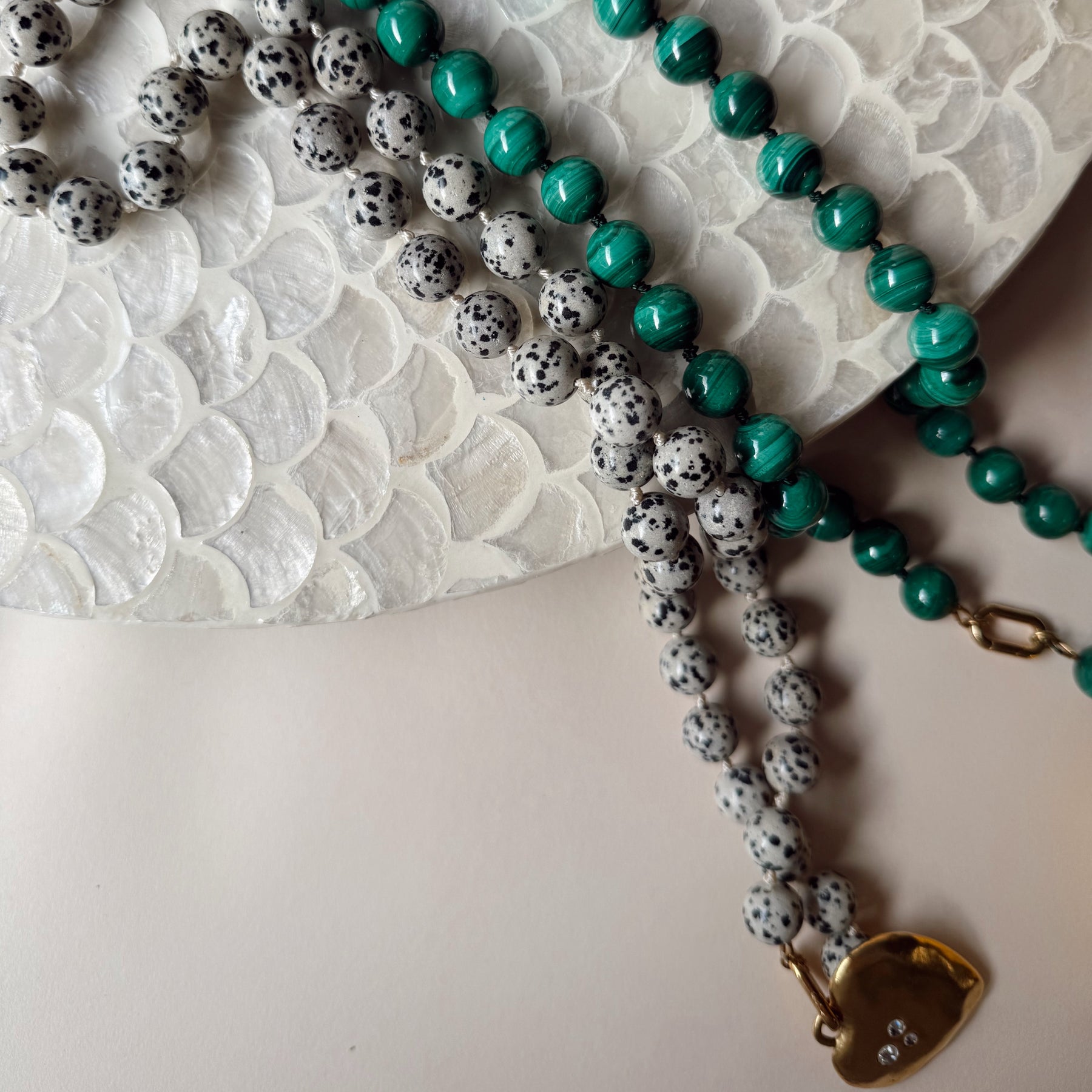 The Doris Necklace is a statement piece rooted in classic craftsmanship and timeless design. Large, polished stone beads are individually knotted on silk, creating both visual rhythm and durability. The knotted construction allows the necklace to drape beautifully while protecting each bead, a traditional technique often found in heirloom jewelry.
