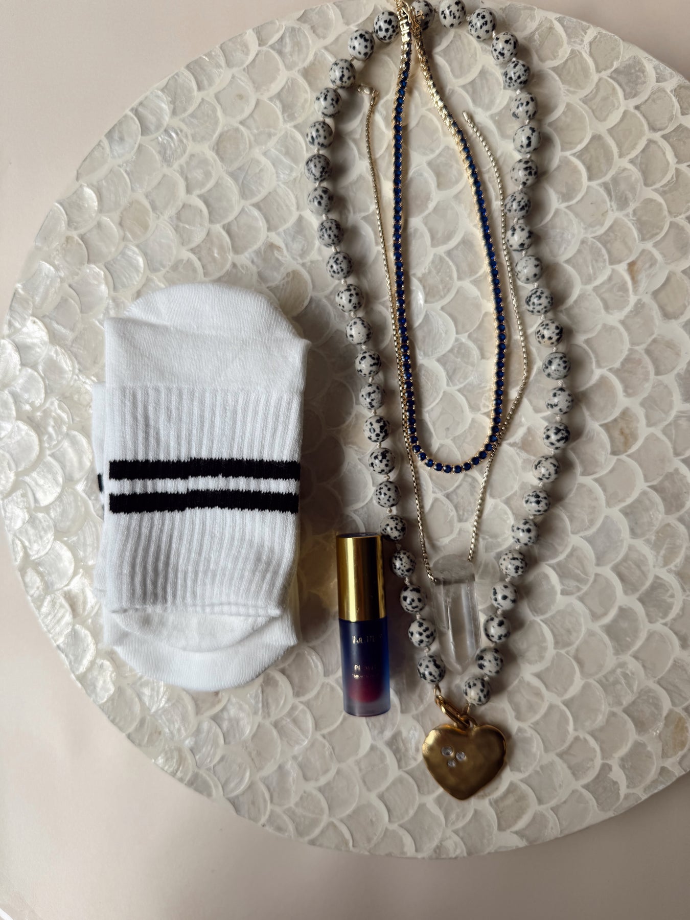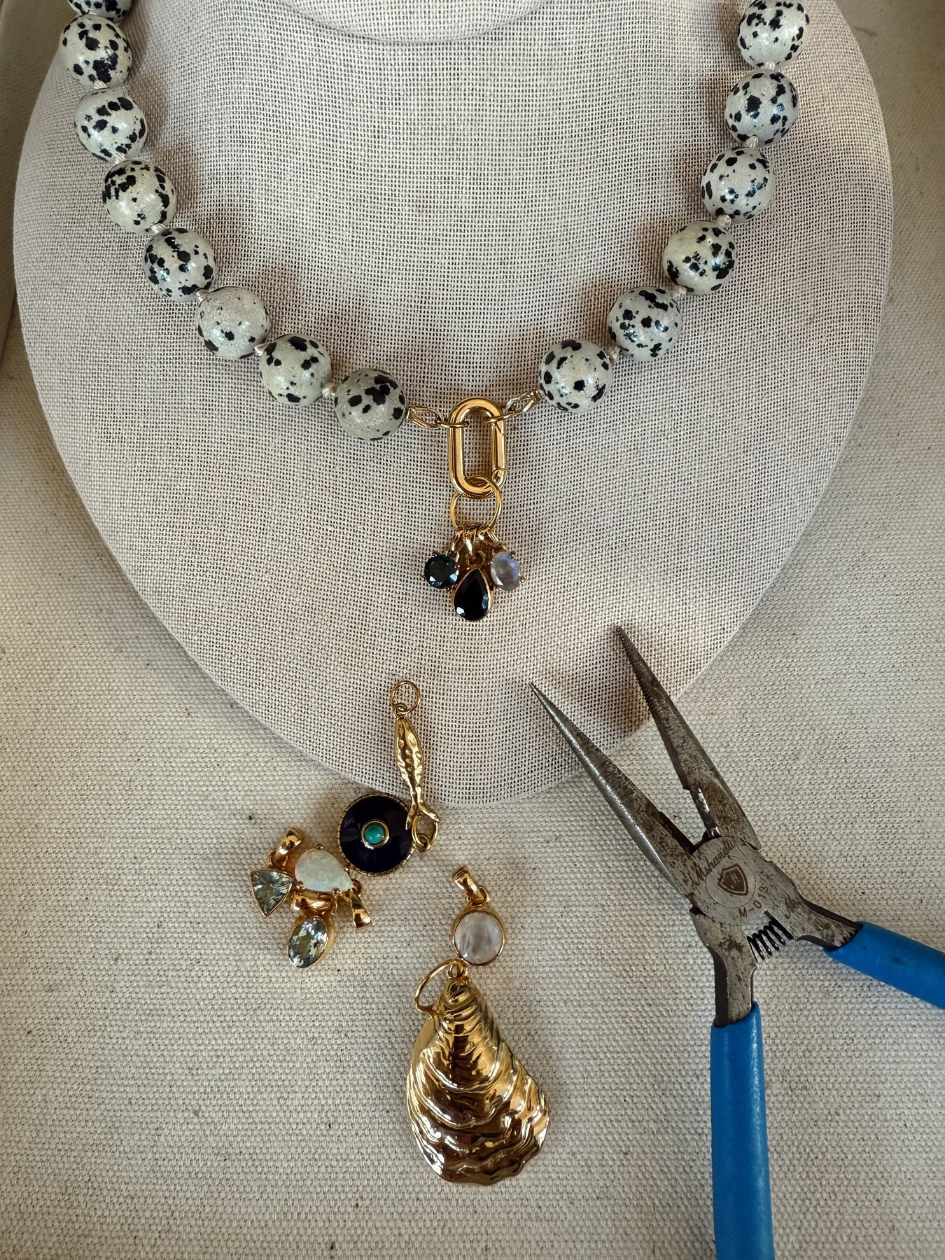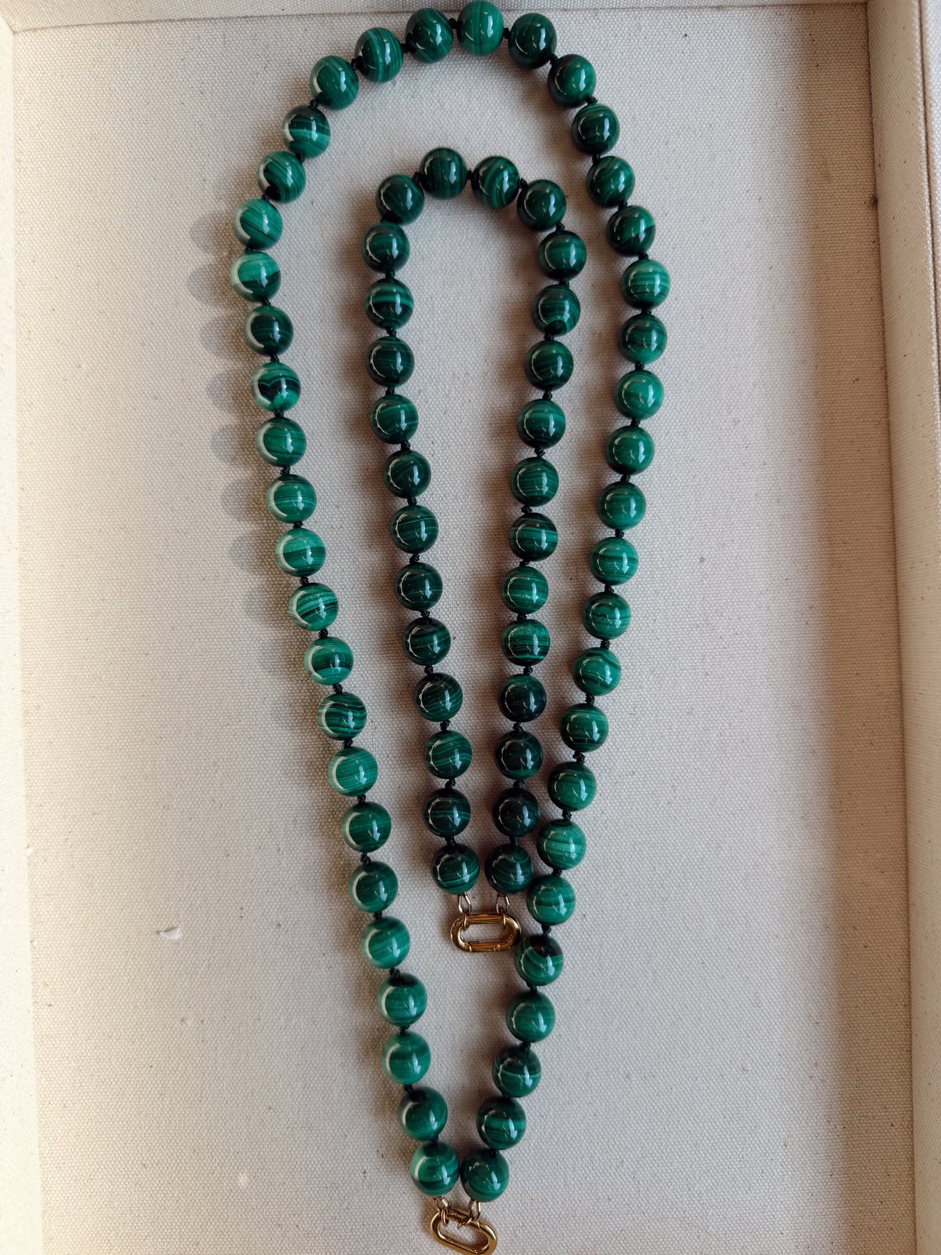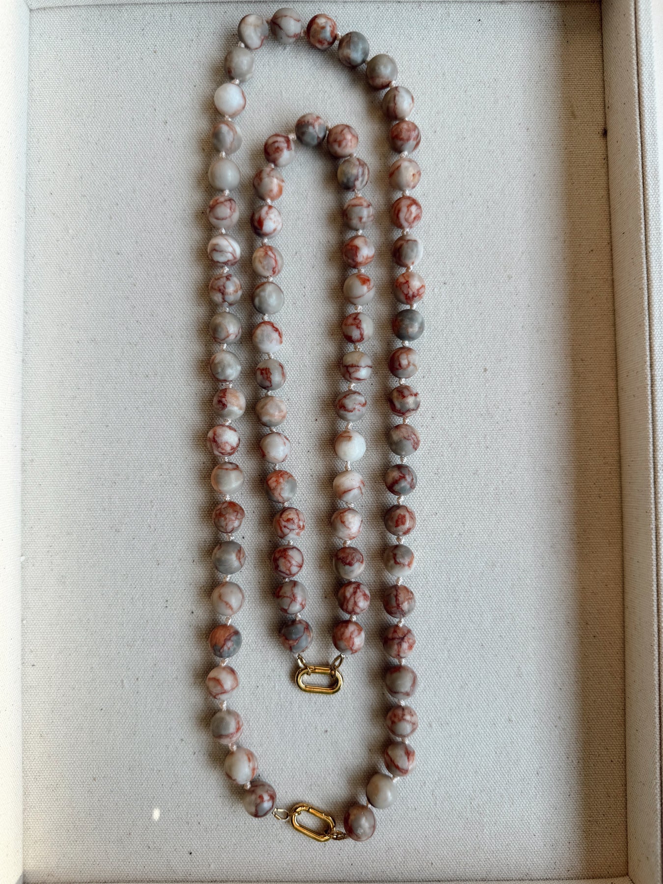 The Doris Necklace is a statement piece rooted in classic craftsmanship and timeless design. Large, polished stone beads are individually knotted on silk, creating both visual rhythm and durability. The knotted construction allows the necklace to drape beautifully while protecting each bead, a traditional technique often found in heirloom jewelry.