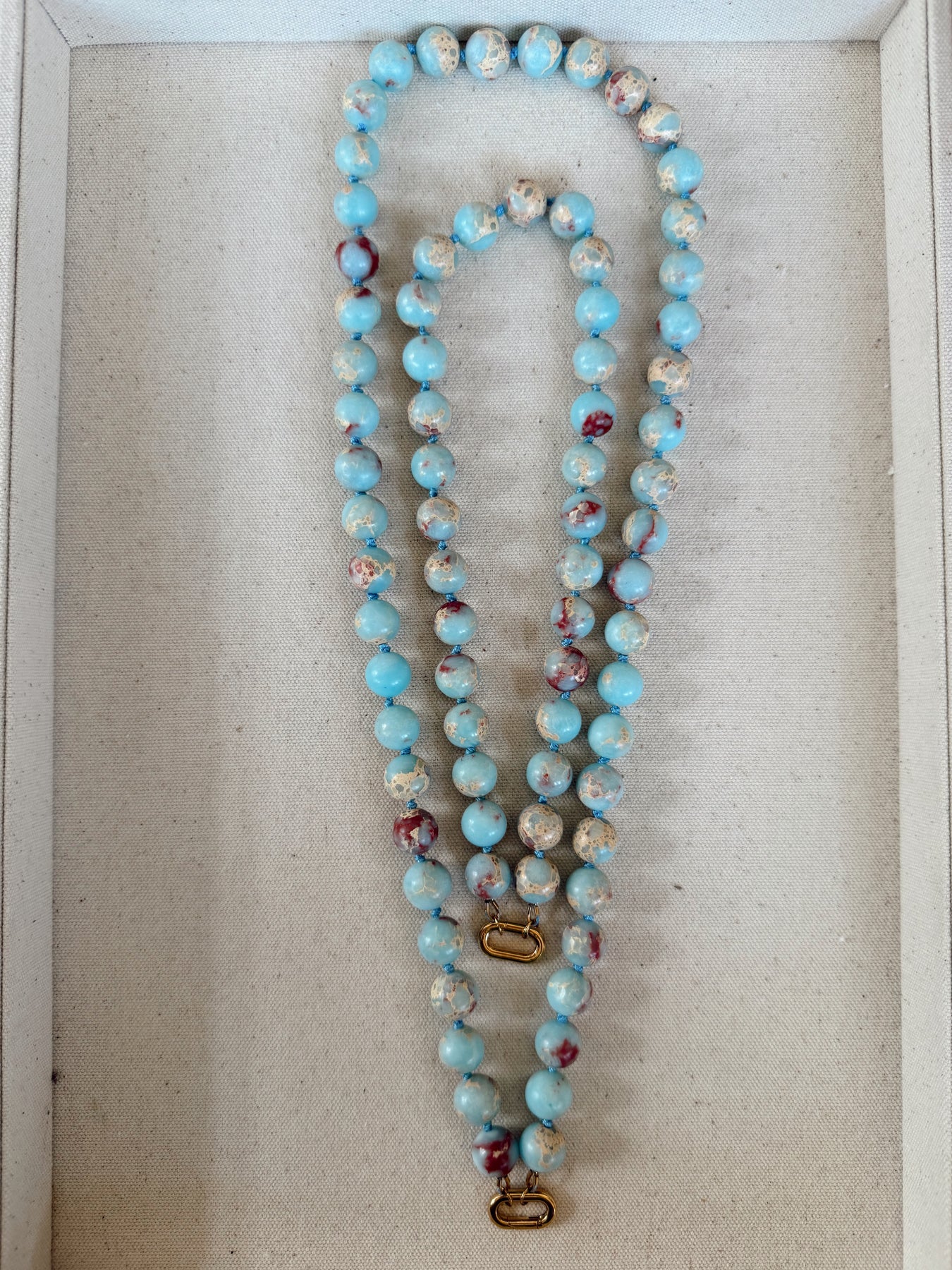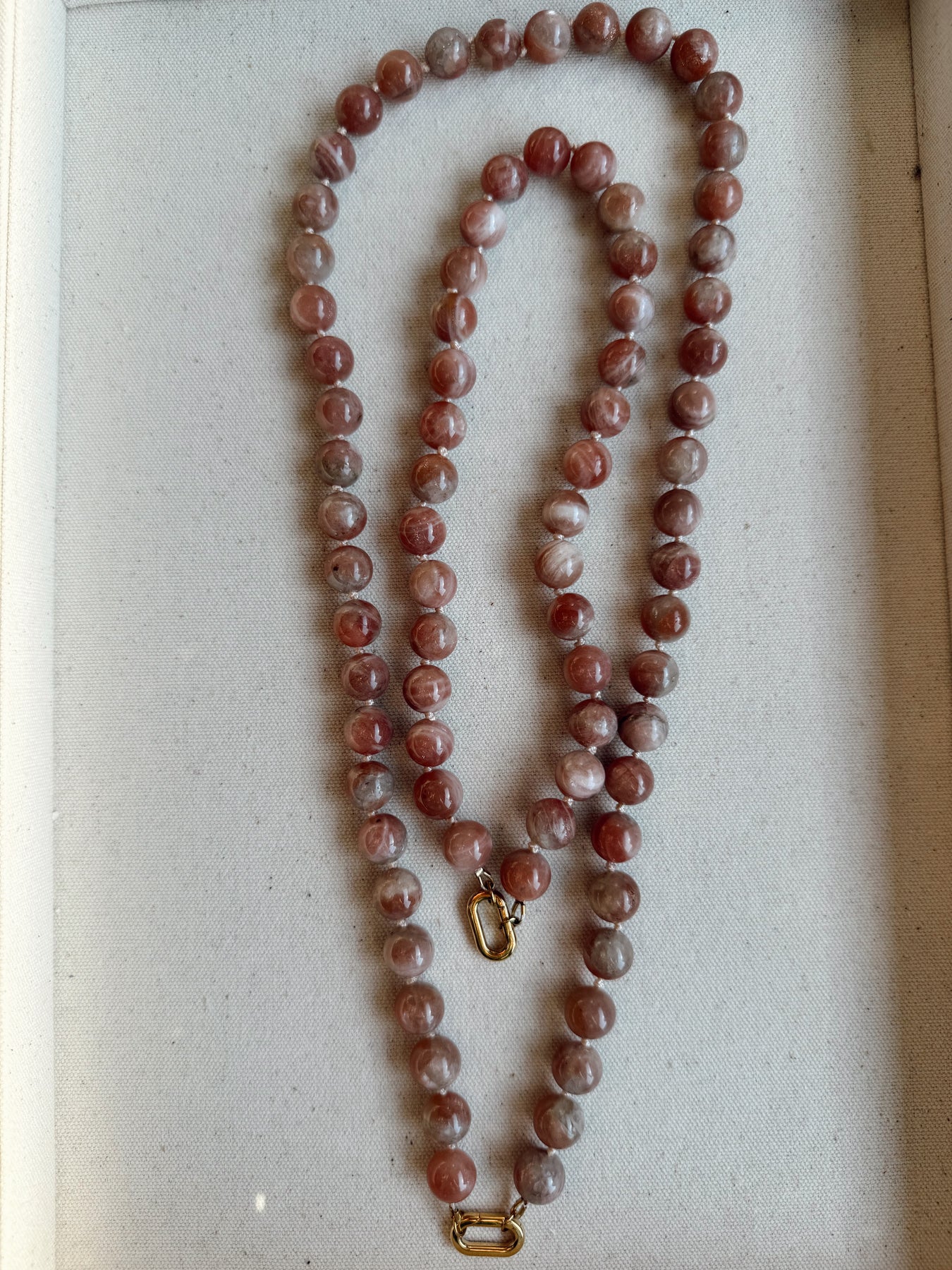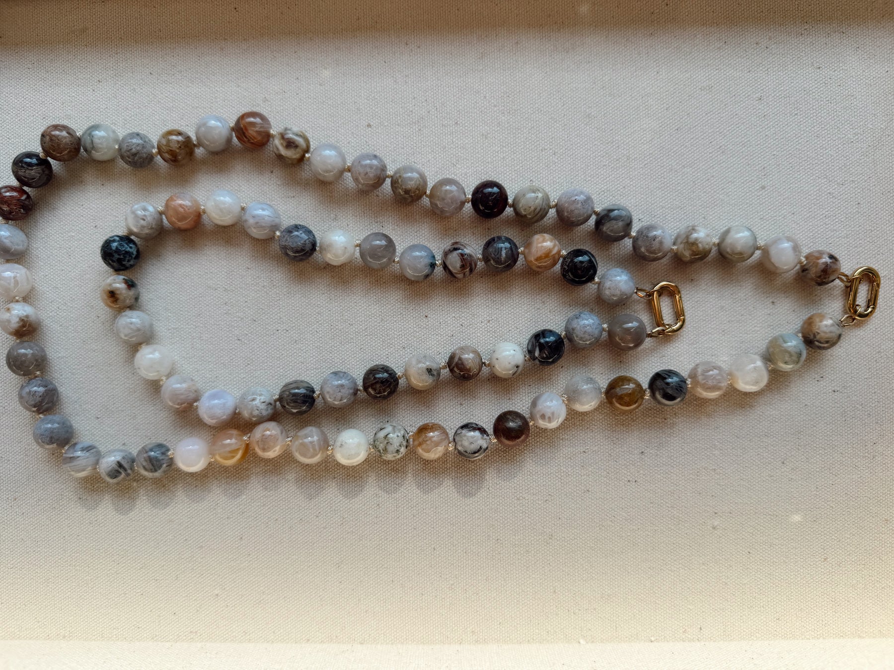 A hand-knotted necklace featuring large round stone beads separated by silk knots and finished with a gold PVD charm clasp.